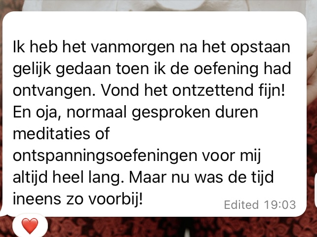 Je houdt toegang tot de oefening zolang je whatsapp hebt en de groep niet verwijderd en kan deze altijd herhalen. Je loopt nooit achter, ook niet als je een dag overslaat.